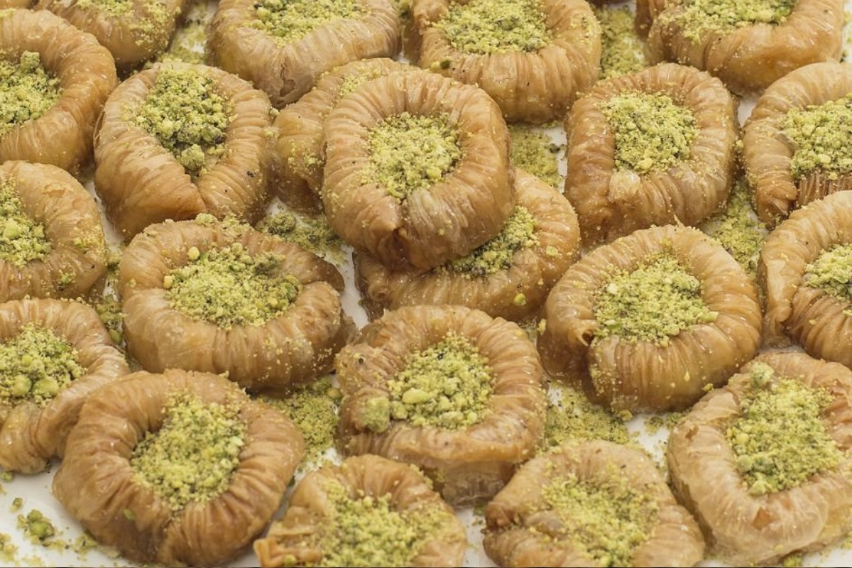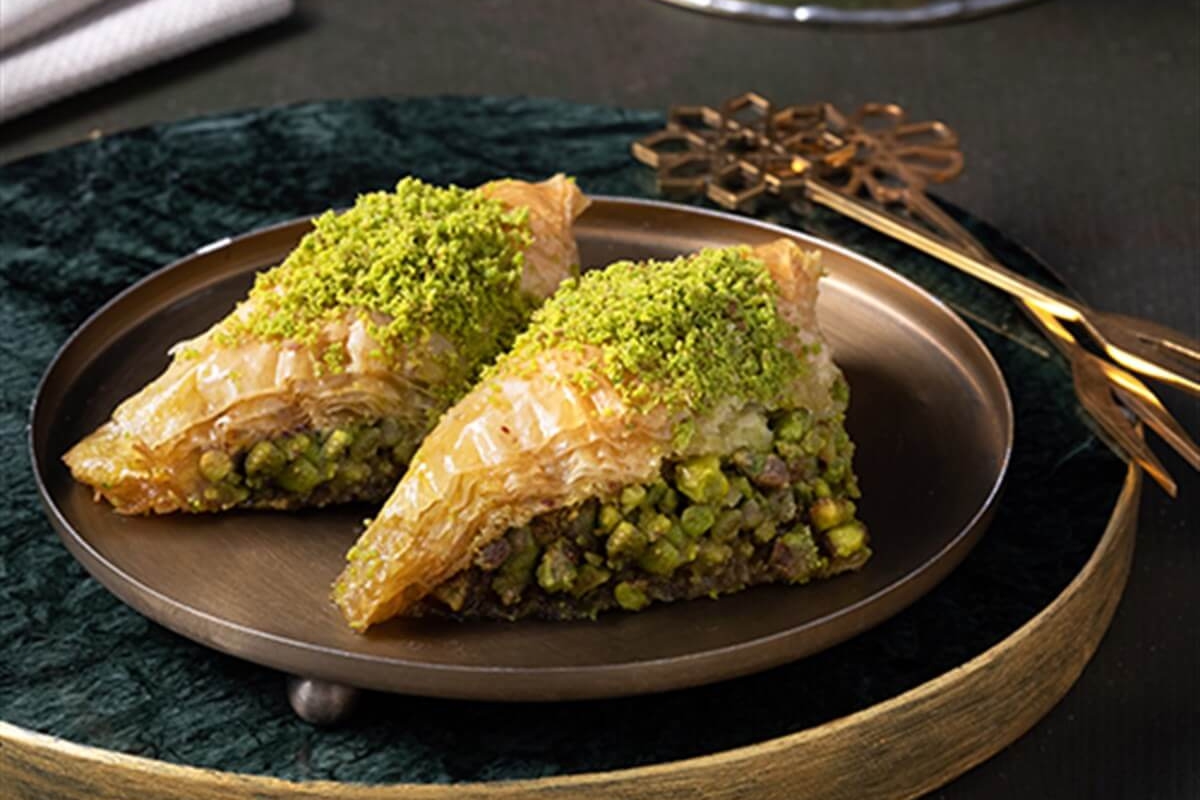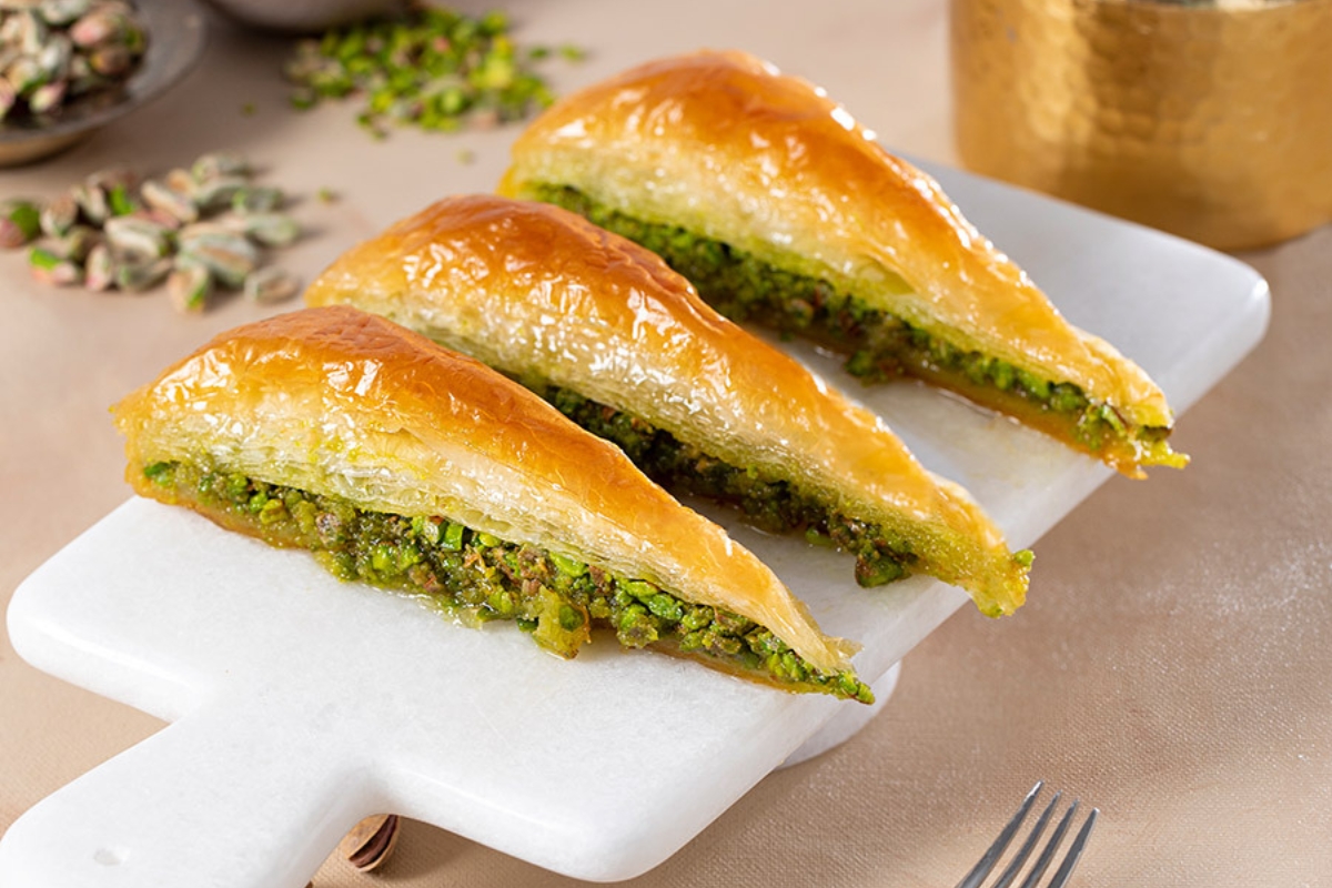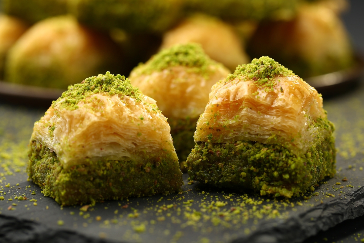 It features layers of flaky phyllo dough filled with a rich and creamy mixture of ground pistachios and cream.