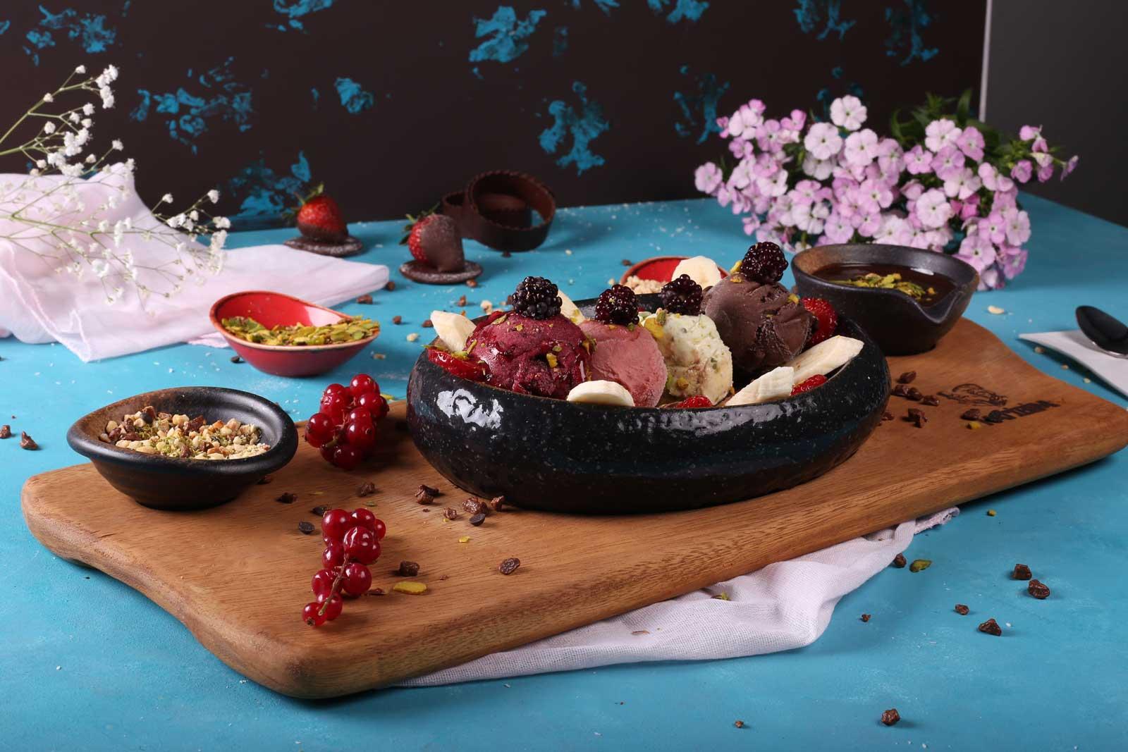 Ice cream platter with forest fruits