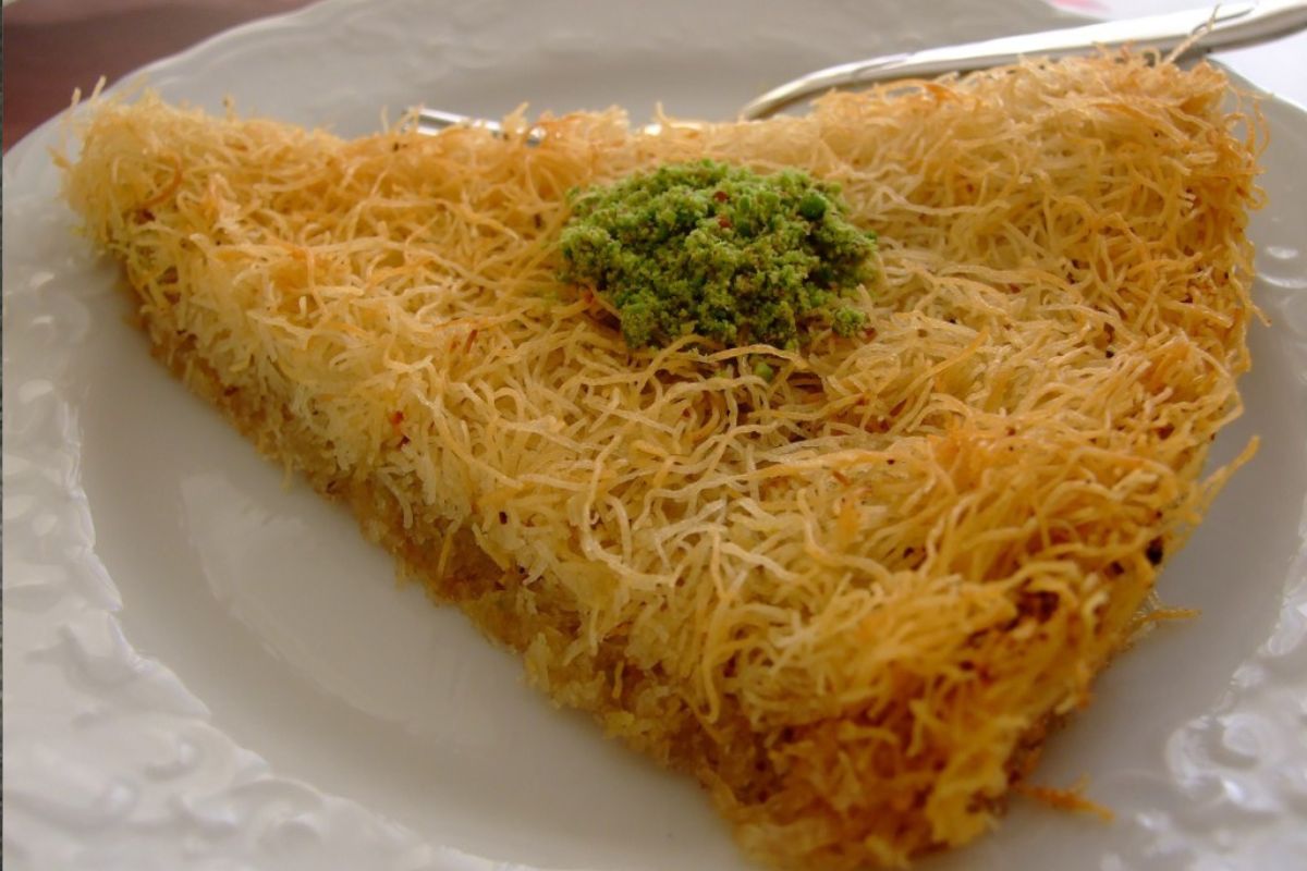 Kataif or Qatayef, this appetizer has a deliciously creamy and oozy cheese filling enclosed in a crispy outer shell, creating a delightful contrast of textures. Savouring this treat will allow you to feel the pure joy of its incredibly gooey and delightfully stretchy texture as you eat it. The dish is drenched in a seductive sweet sugar syrup, which elevates the flavour experience even further and gives it the mouthfeel of a paradisiacal delight.